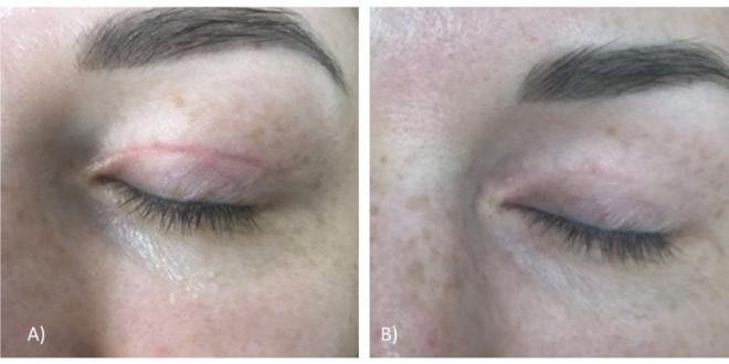 B) The result after 3 treatments: the scar is significantly improved and barely noticeable. Almost no trace of the surgery left.